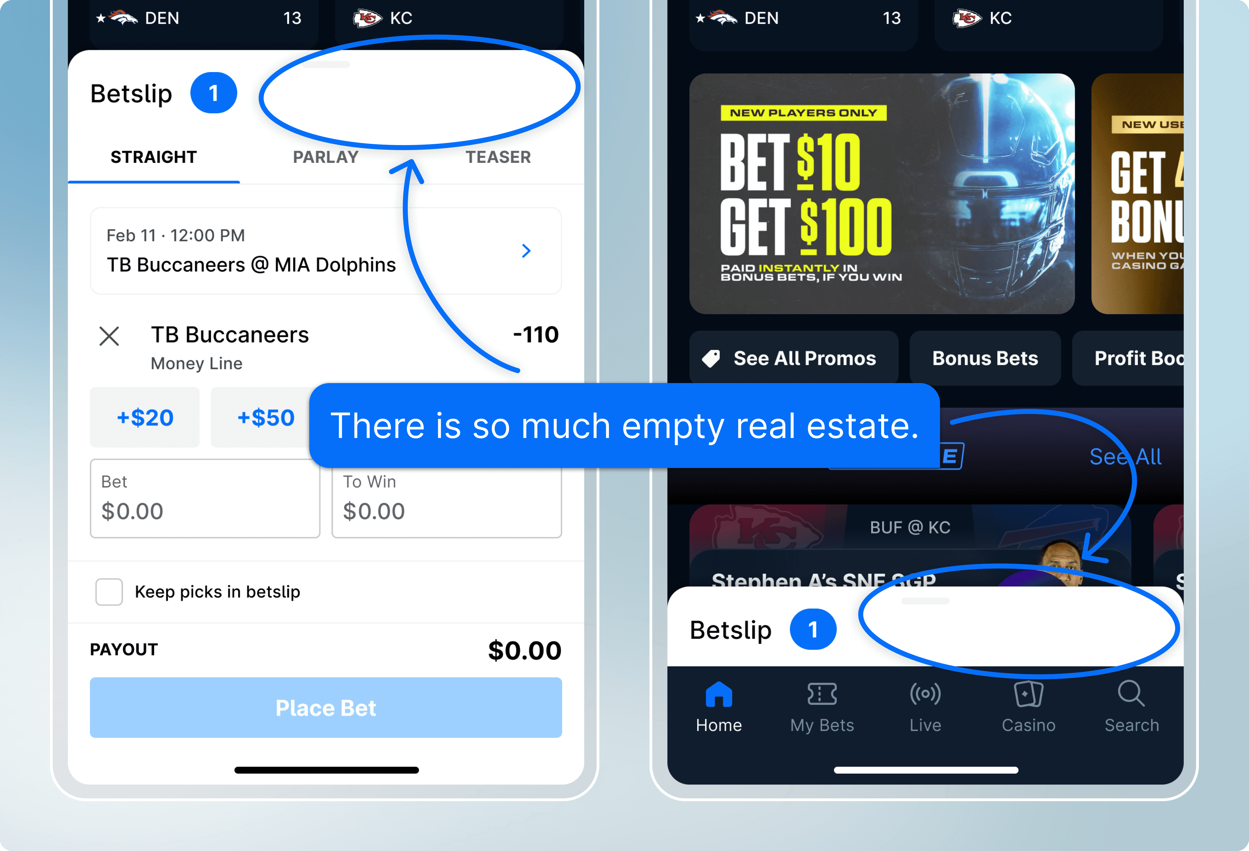 The betslip is the single most valuable conversion surface in the sports book, yet today it suffers from incremental, disconnected changes that add unnecessary complexity and wasted space in a highly constrained UI. Through a strategic overhaul of the betslip, we aim to reduce friction, improve clarity, and maximize conversion.